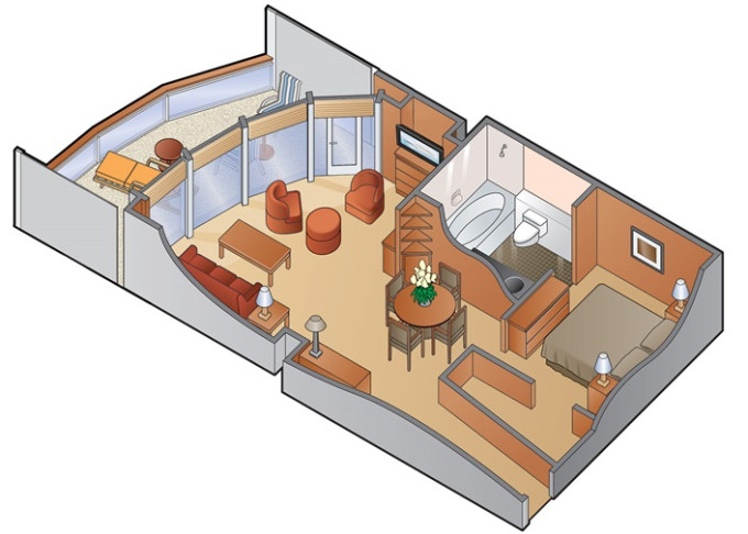 | CS - Celebrity Suite 44 m² + balkón 8 m². Kúpeľňa s vírivkou. 6. až 9. paluba. Max 3 osoby. Výhody Suite The Retreat. | 25 636 € 6 409 € za osobu | ||