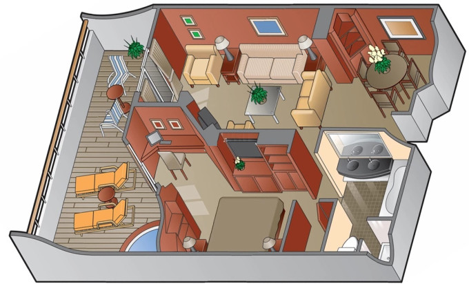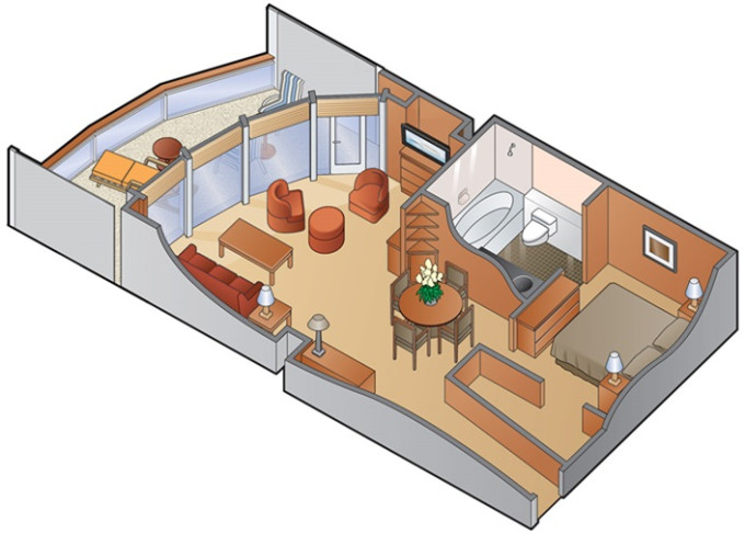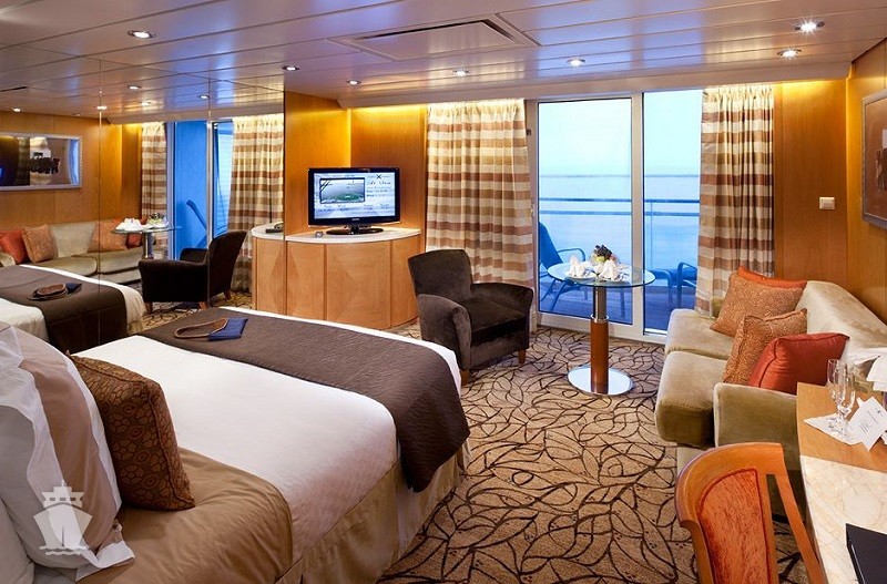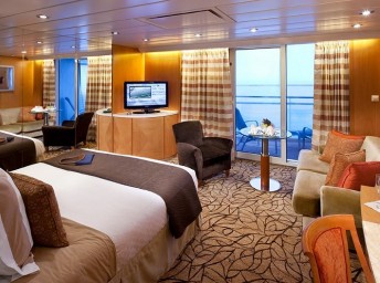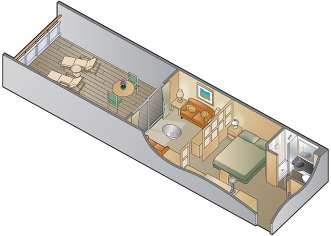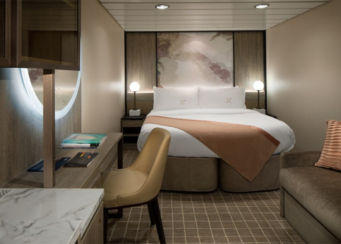 - Kajuty sú umiestnené v blízkosti lodného Spa. K ich vybaveniu patrí posilnený systém vzdušnej filtrácie, posteľ Queen-Size (v kategóriách Edge King-Size), veľké zasúvacie sklenené dvere, exkluzívne posteľné prádlo eXhale®, veľkorysé skladovacie priestory.