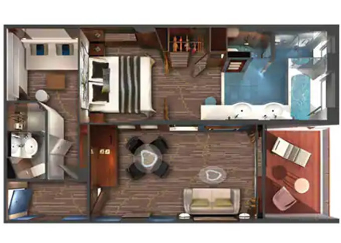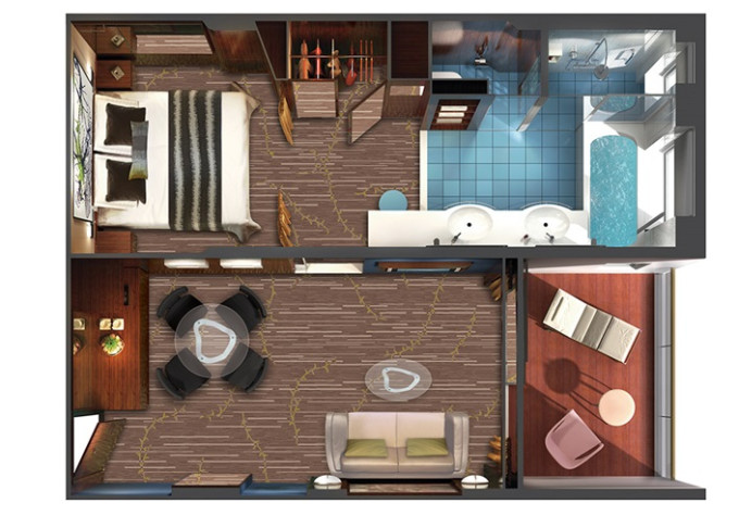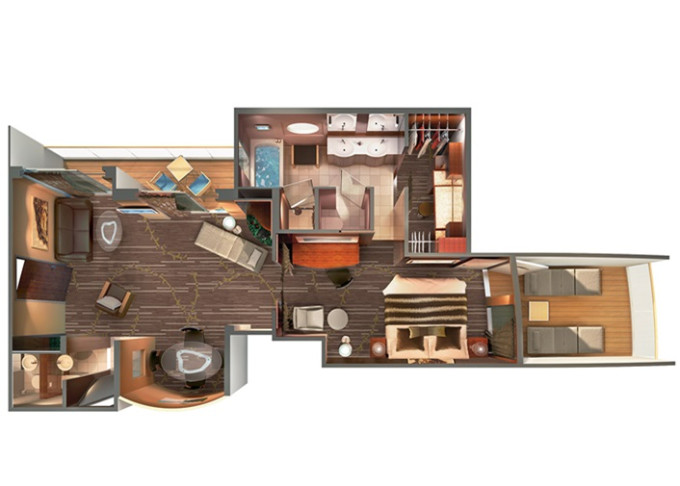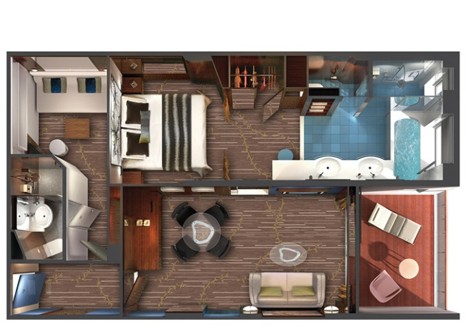 | S4 - Deluxe Family Suite - 2 spálne 51 m² / balkón 5 m². 11. paluba - vpredu, stred. Max 6 osôb. Výhody Suite. | 15 268 € 7 634 € za osobu | ||