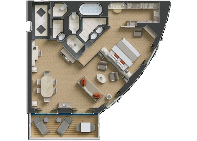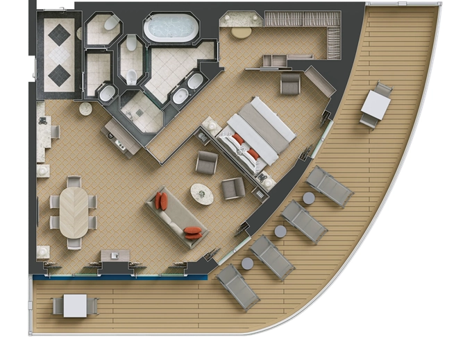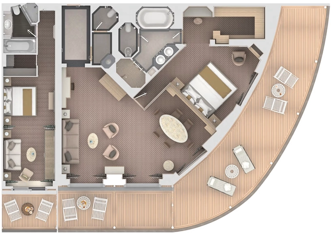 | R1 - Royal Suite 1 105 m² (vrátane balkónu). 7. paluba vpredu. Max 3 osoby. | 51 200 € 51 200 € za osobu |