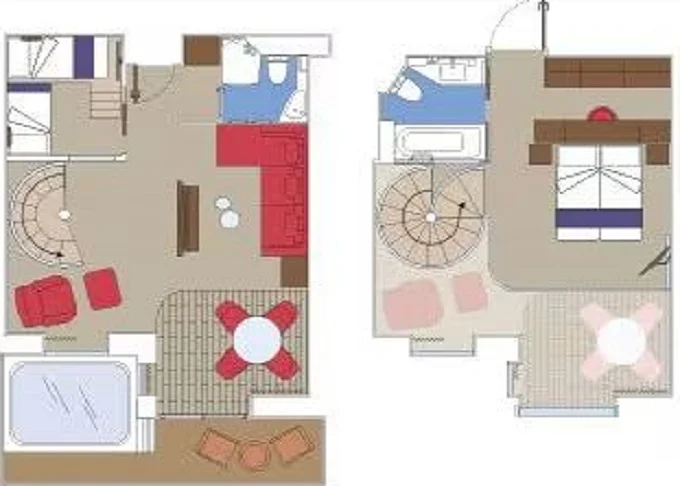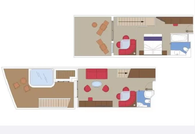 | YJD - Yacht Club Duplex Suite s vírivkou 46 m² + balkón 30 m². Vírivka. 2 podlažia, šatník, 2 kúpeľne (1 s vaňou). Max 4 osoby. 16. paluba. Cenový model MSC Yacht Club. | 10 222 € 5 111 € za osobu | ||