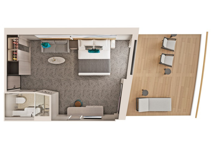 | MB - Club Suite Forward-Facing 22-25 m² / balkón 7 m². 9. až 13. paluba - vpredu. Max 2 osoby. Výhody Club. | 4 848 € 2 424 € za osobu | ||
