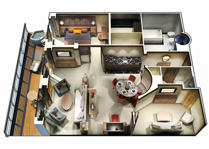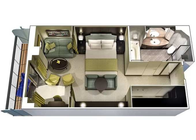 | VS - Vista Suite od 87 m² + balkón s vírivkou od 24 m². 8,9,10,12. paluba. Max 2-3 osoby. 3 izby: spálňa, veľká obývacia miestnosť s jedálenskou časťou, zariadená fitness miestnosť, 2 kúpeľne (1 s vírivkou), šatník. Výhody Vista Suite. | 24 478 € 12 239 € za osobu | ||