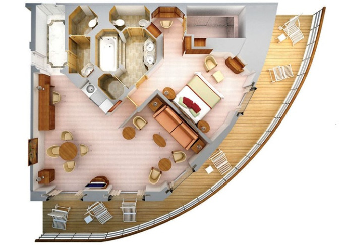 | R1 - Royal Suite 1 92 m² (vrátane balkóna 12 m²), Spálňa s obývacou a jedálenskou časťou. 7. paluba vpredu. Max 3 osoby. | 34 600 € 17 300 € za osobu | ||