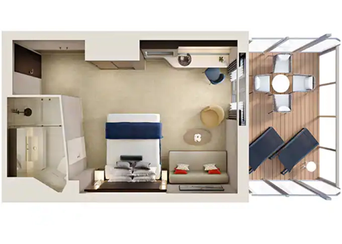| B1 - Kajuta s veľkým balkónom Aft-facing 21 m² / balkón 8 m². 7. až 10. paluba - vzadu. Max 3 osoby. | 7 082 € 3 541 € za osobu | ||